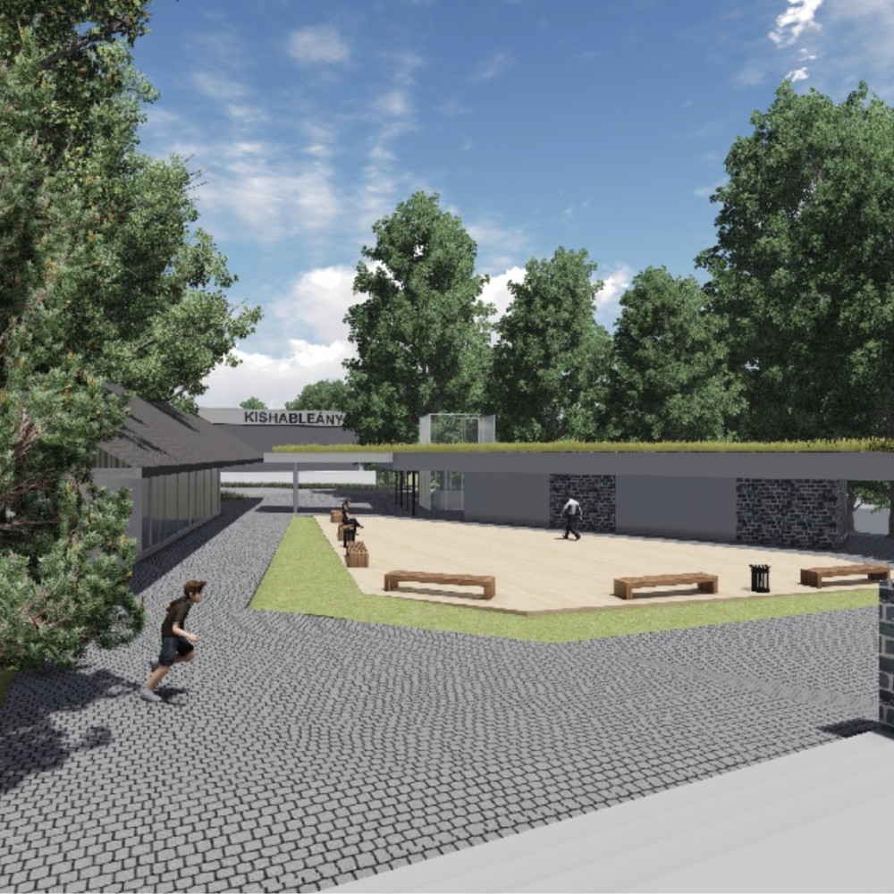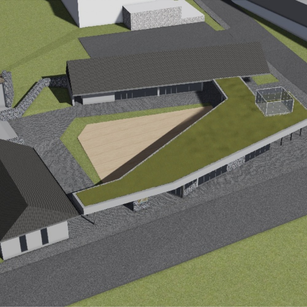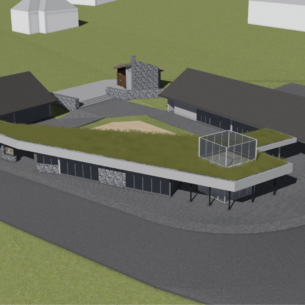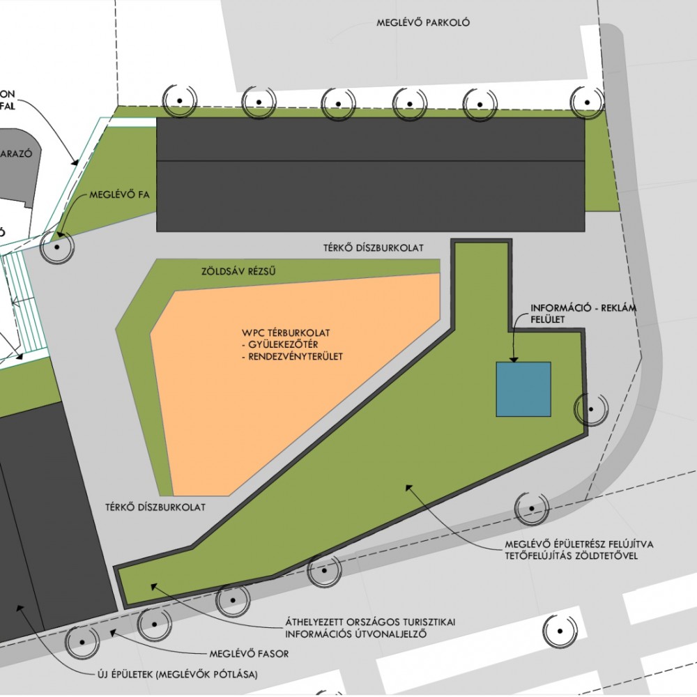 Tervünkben az építészeti érték nélküli építmények elbontását javasoljuk, a megmaradó épületek bővítésével és átépítésével egy új turisztikai információs és fogadóközpontot hozzunk létre. Az egyes funkciókat összefüggő zöld tetővel összefogva oldjuk meg, melyet északi és nyugati oldalán magas tetős épületszárnyak határolnak. Az egykori Poharazó az épületegyüttes integráns része.