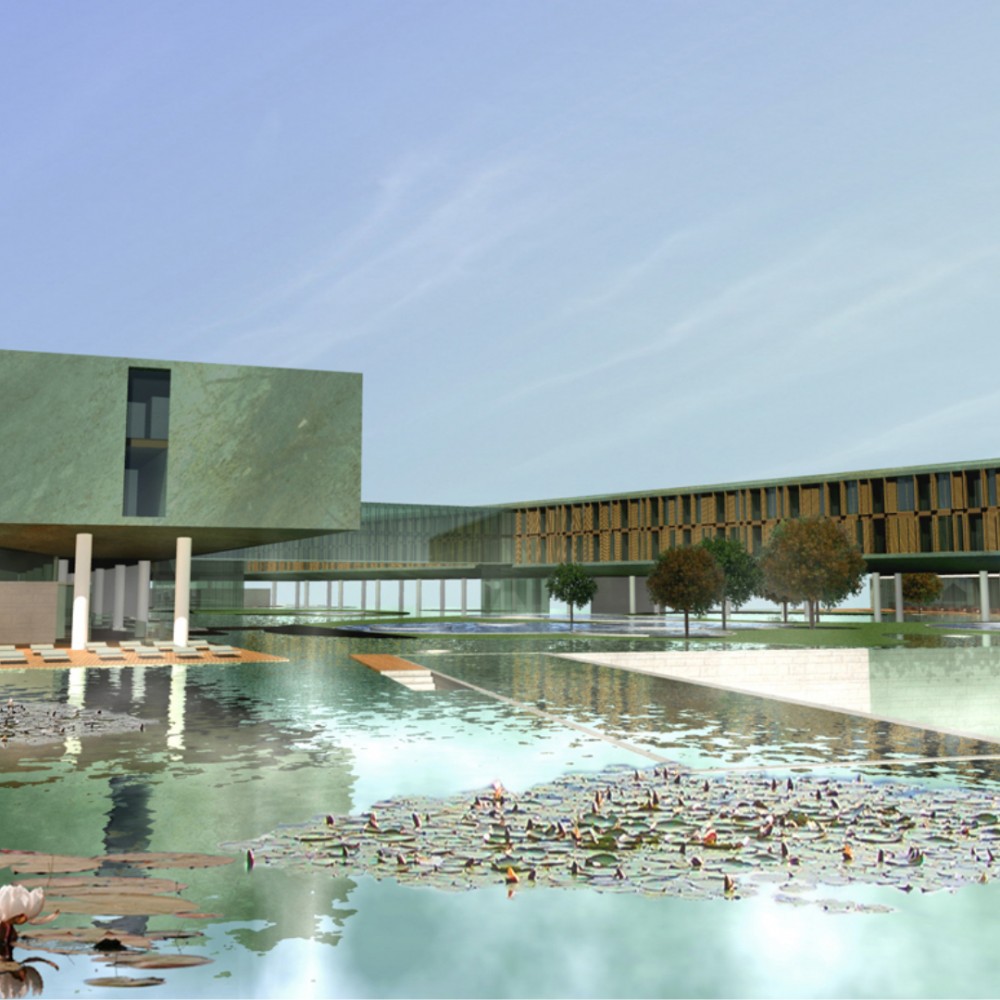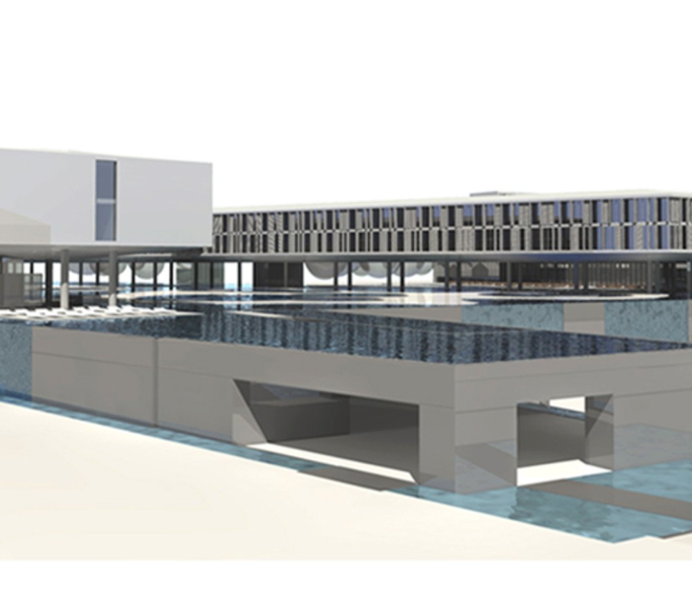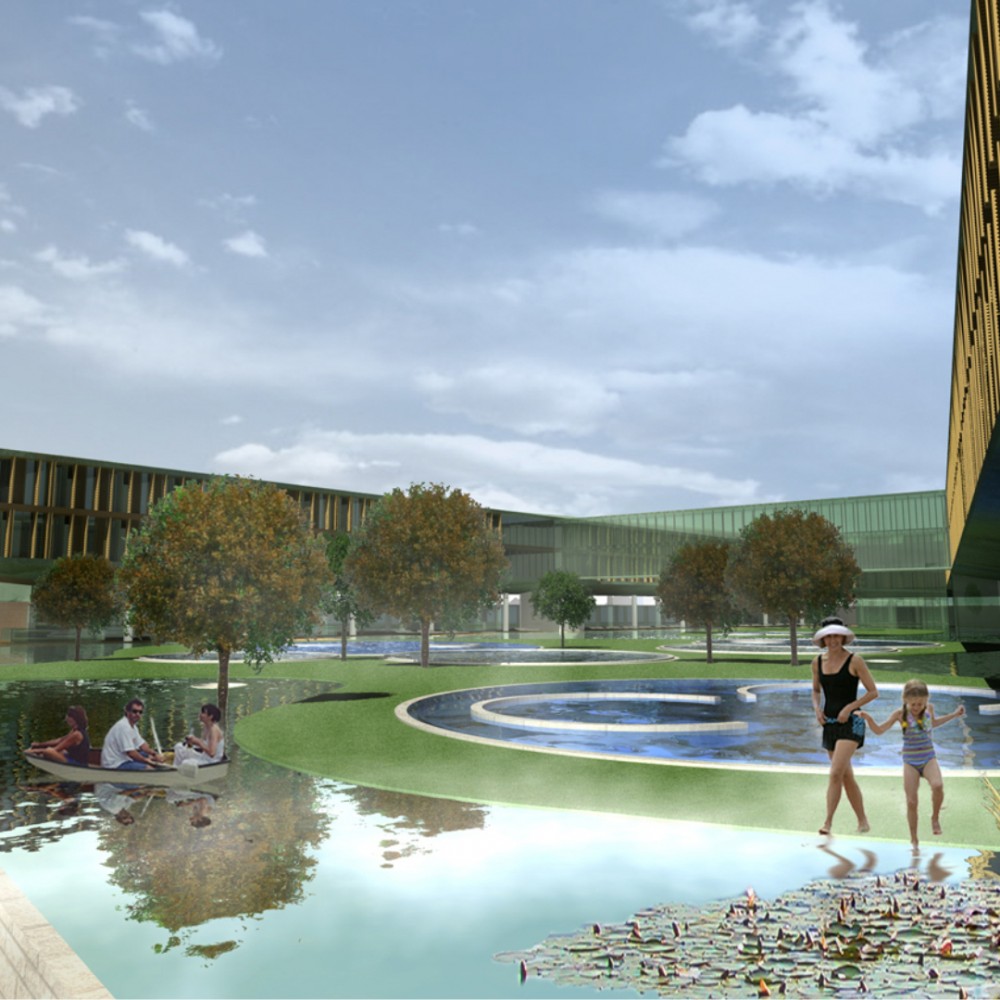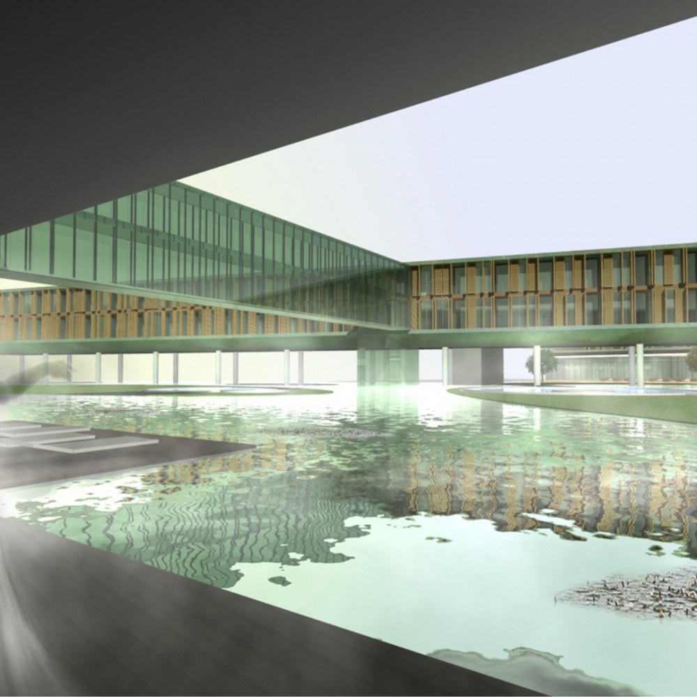 Pályamunkánkkal a kijelölt helyszínen egy szigetet és tavat hoztunk létre melynek víztükörszintjét megemeltük, így a földszinti kiszolgáló funkciók és parkolók “vízzel fedett” módon valósíthatók meg. A mesterséges tavon egy lendületes vonalvezetésű szállásépület és fogadóépület került elhelyezésre.