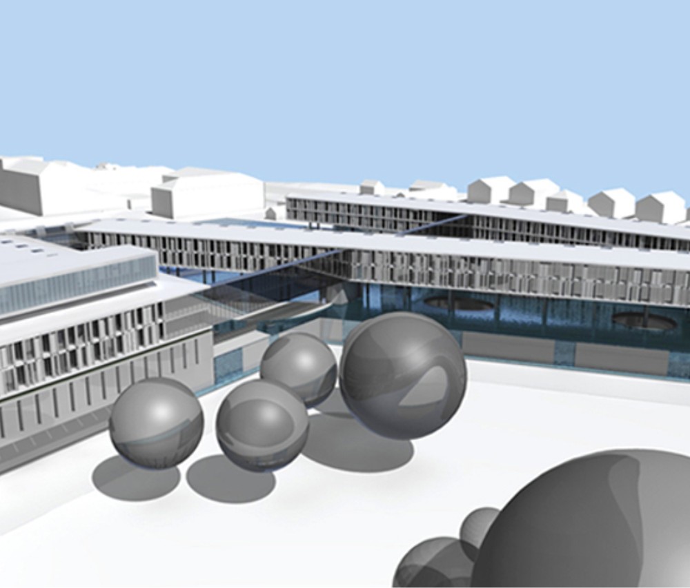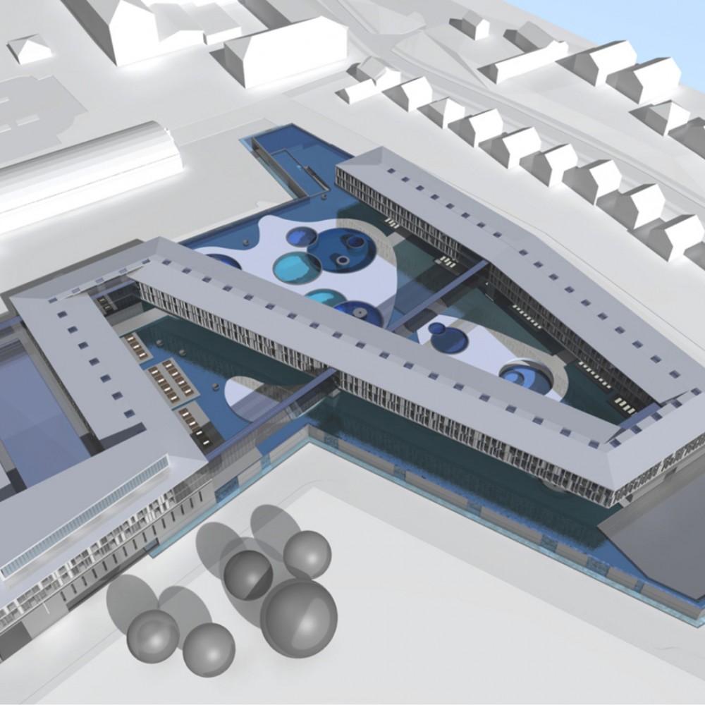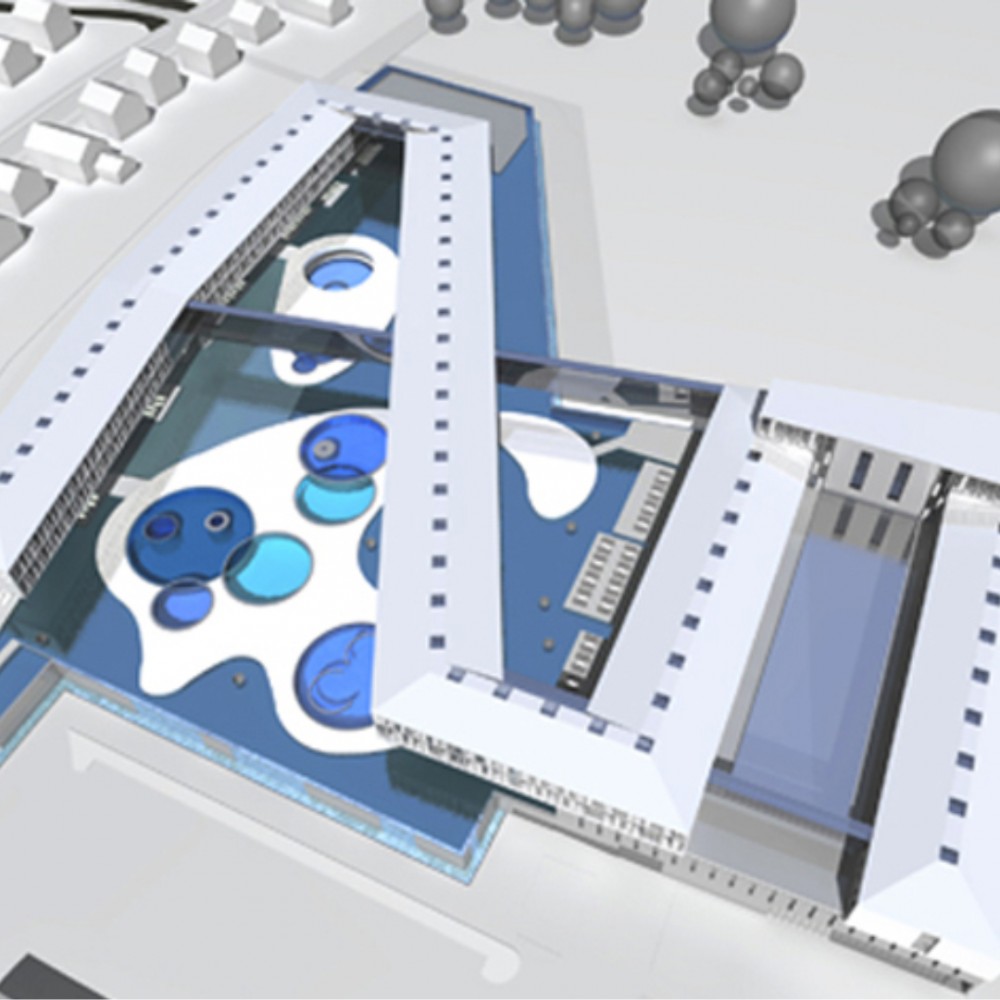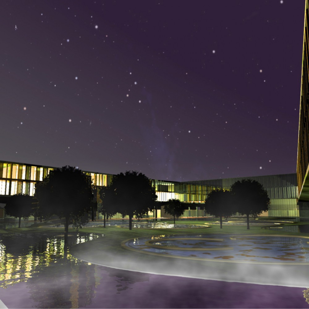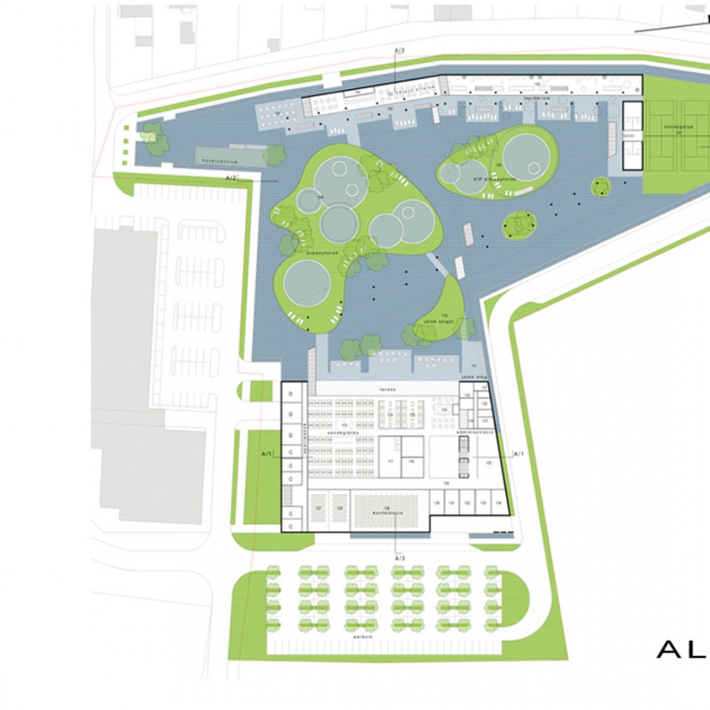 Pályamunkánkkal a kijelölt helyszínen egy szigetet és tavat hoztunk létre melynek víztükörszintjét megemeltük, így a földszinti kiszolgáló funkciók és parkolók “vízzel fedett” módon valósíthatók meg. A mesterséges tavon egy lendületes vonalvezetésű szállásépület és fogadóépület került elhelyezésre.
