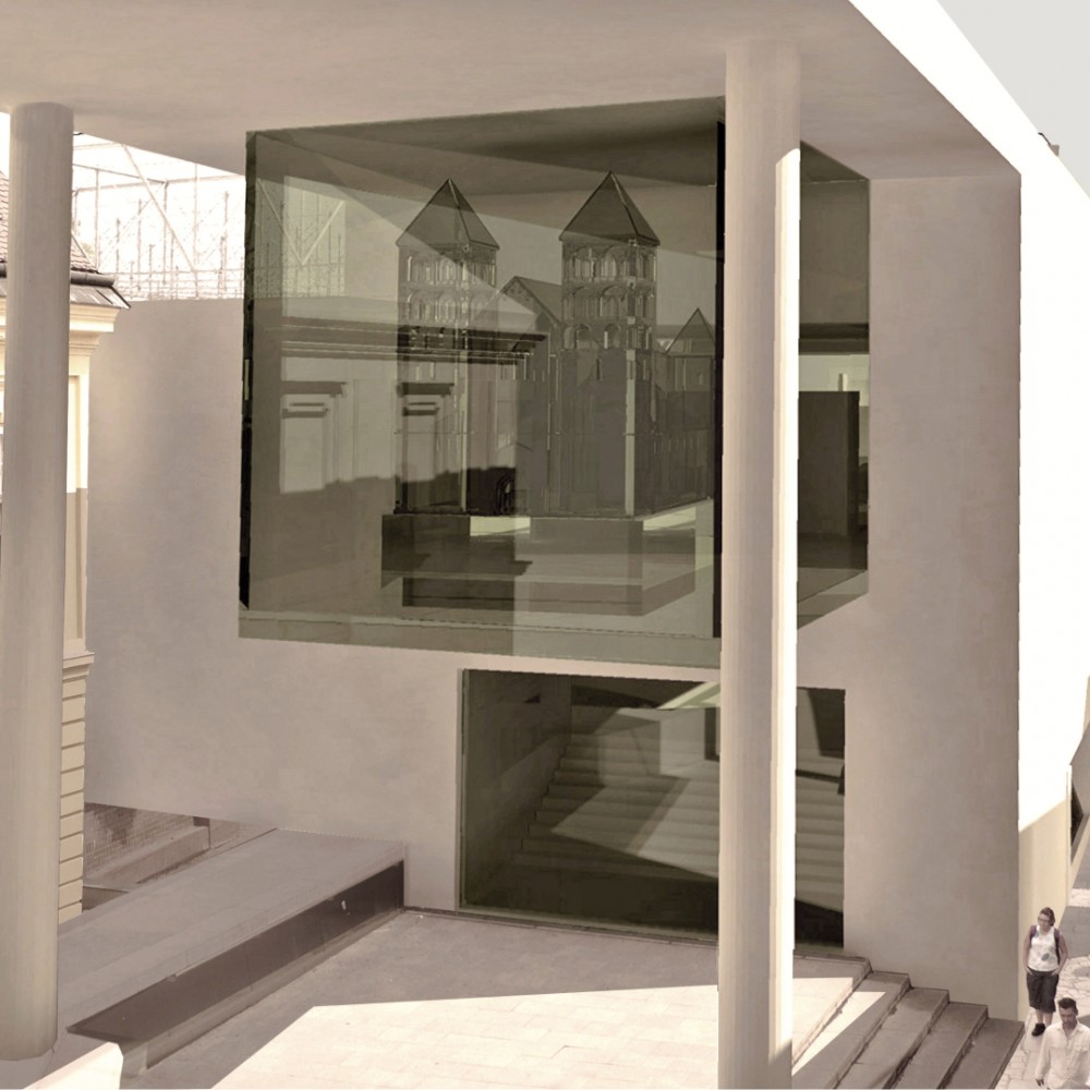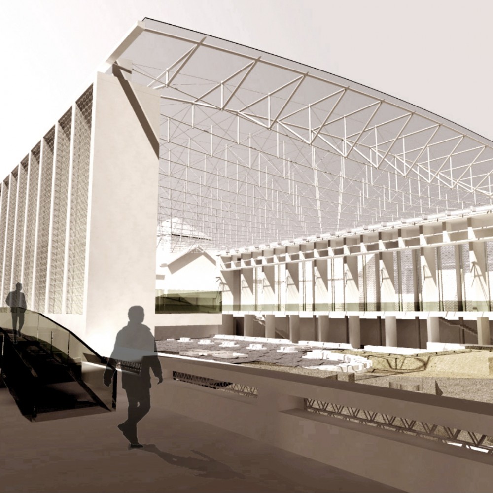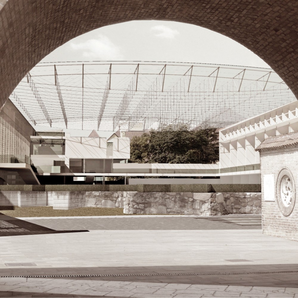 A romok lefedését az árkádokat képező oldalsó lehatárolás felett biztosítottuk, elkerülve a nyomott pince jellegű tereket, valamint az egykori bazilika területének áttekinthetőségét biztosítva. Megoldásunk egyben egységet képez az 1938-ban megvalósult Lux Kálmán és Lux Géza részéről tervezett emlékhellyel. Pályázatunkat a kortárs építészet eszközeivel oldottuk meg, szerves egységbe integrálva a műemléki romterület emlékeit, a korábbi emlékhely épületét és a tervezett új véleményünk szerint izgalmas épületegyüttest.