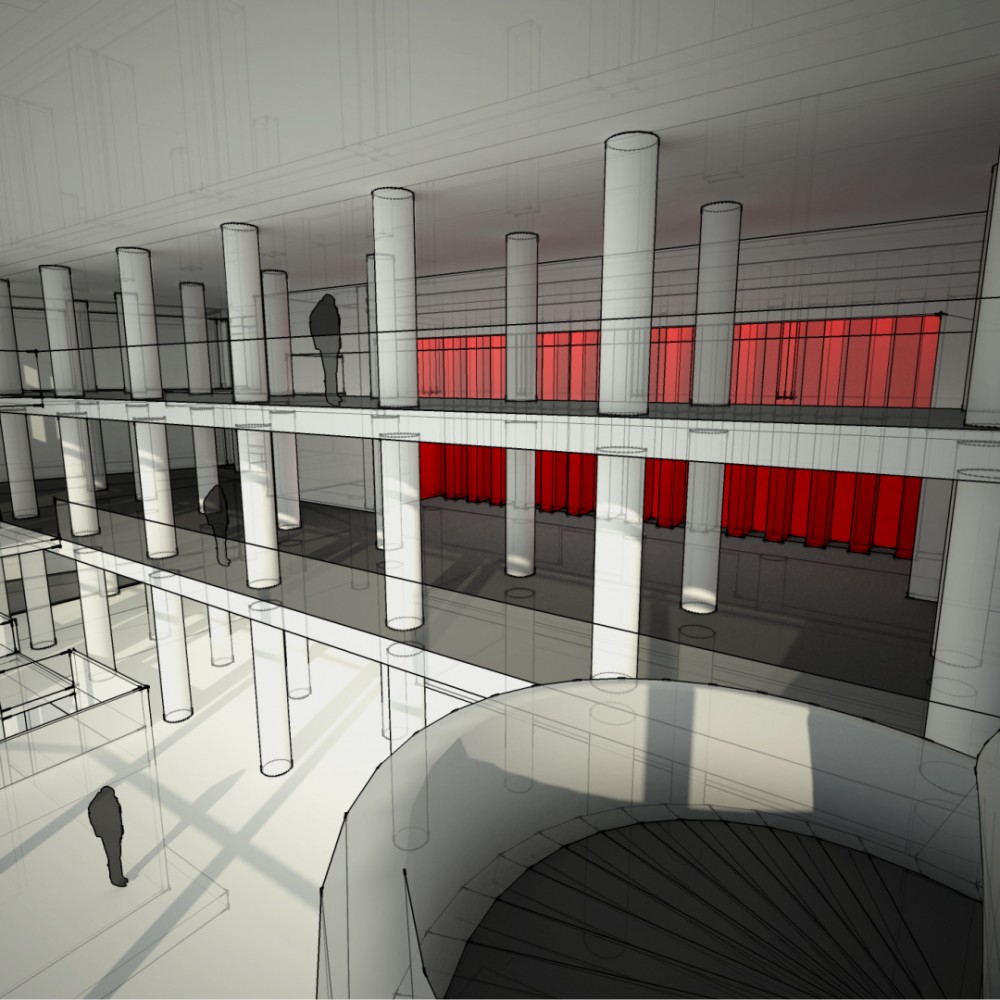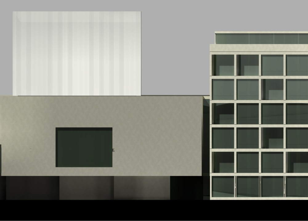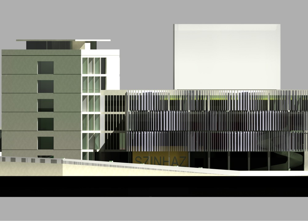Második fordulós tervünkkel a meglévő egészségügyi épület és irodaépület teljes hasznosítására törekedtünk, a színháztéri és színpadi funkciós terek kiegészítésével.